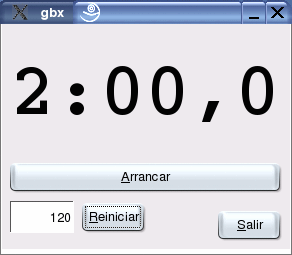 Hemos añadido después del comentario que nos había generado Gambas, ' Gambas class file, una constante que contiene el número de segundos por defecto de la cuenta atrás, fSegundosPorDefecto, con un valor de 120 segundos (dos minutos), y una variable, fSegundos que va a contener la cuenta atrás. Hemos creado también dos procedimientos: VerValores, que visualiza los valores de la cuenta atrás, y VerActivarDesactivar, que cambia el texto del botón de Marcha/Paro.