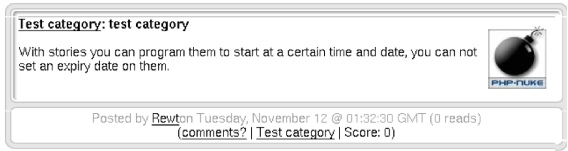 Born as the heart of PHP-Nuke, it was the obligatory Home Page in previous versions. In the last versions it is instead possible to define which modules should appear as the default page. The News module expands its branches on more pages. The first one we see is a collection of the latest News published (it is possible , from the configuration panel [admin->preferences] to choose the number of latest news to be displayed, say 5, 10, 15, 20, 25, 30). In the main page only a small initial text of the news article is published. If the text is too large, it will be possible to read it whole by pressing the link "Read more". The article module has many elements that distinguish it from other ones. In the first place, the title, the topic, that is the main category and is usually characterized by an image that, if clicked, brings up a selection of the articles that belong to this topic. We have a second way to classify the articles, which is to assign them a category they are supposed to belong (see Figure 3-2)