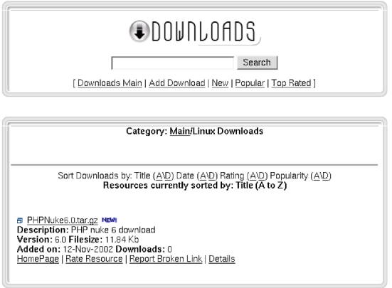 In the main page it is possible to use an internal search engine that searches for keywords among all the files cataloged. There is also the possibility to add external links to a file (these files will not be added immediately, but put in a waiting list until an administrator will approve them and they become visible). We can also base our selection on which files were downloaded most, or which ones obtained the highest score. On this page we can have a list of categories that accompany the files (there may exist subcategories but in Figure 3-3 there is only 1 category, "Linux Downloads"), the user is recognized when he/she views the downloads section after their first visit so if new downloads have been added since the last visit, the corresponding category will be have a "new" icon beside it.