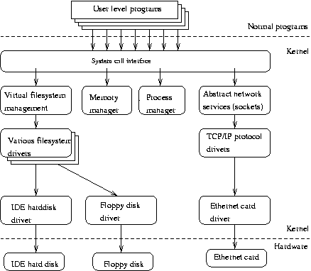 The Linux kernel consists of several important parts: process management, memory management, hardware device drivers, filesystem drivers, network management, and various other bits and pieces. Figure 2-1 shows some of them.