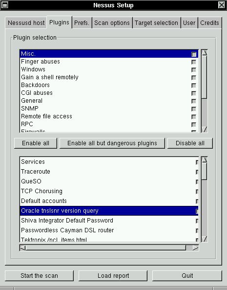The second tab concerns the plugins. Here you select or deselect the plugins you want to use during the scan. For instance, you can disable the dangerous plugins (the ones able to crash a machine !). Clicking on a plugin in the bottom part of the window displays some information about that plugin.