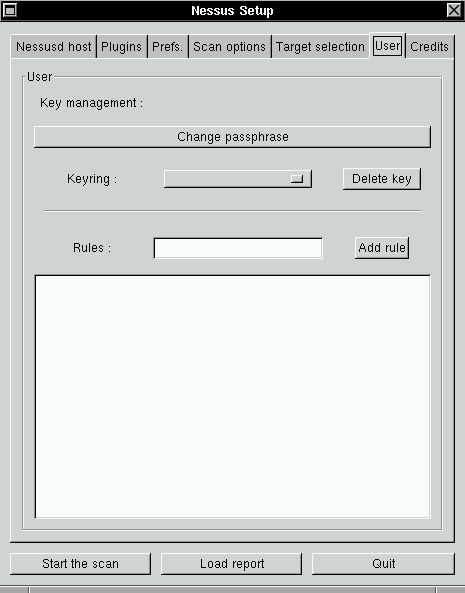 To start nessus, you obviously need to run the server daemon, nessusd. When launching the daemon for the first time you'll have to create a username and password by using the nessus-adduser command. If the nessus libraries package has been compiled with the "--enable-cipher" option (highly recommended, not to say mandatory !), nessus generates a private key. This key can be protected with a passphrase. The server has many options available and you'll find them all in the nessusd man page.