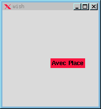 Exemple: place [ label .l -text "Avec Place"] -x 100 -y 100 .l configure -bg red