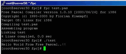 begin Writeln('Bonjour tout le monde, de la part de Pascal !!!'); End.Sauvegardez ce fichier sous le nom « bonjour.pas ». Ensuite, nous entrons dans le processus de compilation. Pour compiler ce fichier, entrez juste la commande :