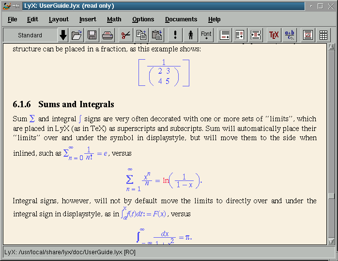 LyX°¡ °¡Àå °¢±¤¹ÞÀº ºÐ¾ß°¡ ¹Ù·Î ¼öÇаèÀÌ´Ù. °£´ÜÇϰí Á÷°üÀûÀÎ ¹æ¹ýÀ¸·Î ¼ö½ÄÀ» ÀÛ¼ºÇÏ¿© ±×·¸°Ô ÈǸ¢ÇÑ Ãâ·Â°á°ú¸¦ ¾òÀ» ¼ö ÀÖ´Â °ÍÀº LyX»ÓÀÏ °ÍÀÌ´Ù. ÀÌ ¸»Àº °áÄÚ °úÀåÀÌ ¾Æ´Ï´Ù. ÀÌ·¯ÇÑ LyXÀÇ ±â´ÉÀº ¾ÕÀ¸·Î ³ôÀÌ Æò°¡¹ÞÀ» °ÍÀÌ´Ù. ÀϹÝÀûÀ¸·Î ´Ù¸¥ ÆíÁý±â´Â ´Ù¼Ò º¹ÀâÇÑ ¼öÇÐÇ¥Çö½ÄÀ» »ç¿ëÇϰԵȴÙ. ..ÀÌÁ¦ LyX¸¦ »ç¿ëÇØ º¸¶ó.¿©·¯ºÐÀÇ ½Ã°£À» ÁÙÀÏ ¼ö ÀÖÀ» °ÍÀÌ¸ç ¿©·¯ºÐÀÌ »ý°¢ÇÏ´Â ¼ö½ÄÀ» ¹Ù·Î È­¸é¿¡ ³ªÅ¸³» ÁÙ °ÍÀÌ´Ù.: ¾Æ·¡Ã·ÀÚ, ÀûºÐ±âÈ£, ºÐ¼ö, ¹«¸®¼ö, È­»ìÇ¥, °ýÈ£, Çà·Äµî ¾Æ¹«¸® ¸¹¾Æµµ ¹Ù·Î Ãâ·ÂÇÒ ¼ö ÀÖ°Ô µÉ °ÍÀÌ´Ù..... ¿©·¯ºÐÀÌ ÀÌ¹Ì LaTeX¸¦ ¾Ë°í ÀÖ´Ù¸é ¿©·¯ºÐÀº Áö±Ýó·³ ÇÏ´ø ¹æ½Ä´ë·Î ¼ö½ÄÀ» ÀûÀ¸¸é µÈ´Ù. ±×·¯¸é LyX´Â ¹Ù·Î ¿©·¯ºÐÀÌ ¿øÇÏ´Â ¼ö½ÄÀ» È­¸é¿¡ º¸¿©ÁÙ °ÍÀÌ´Ù.