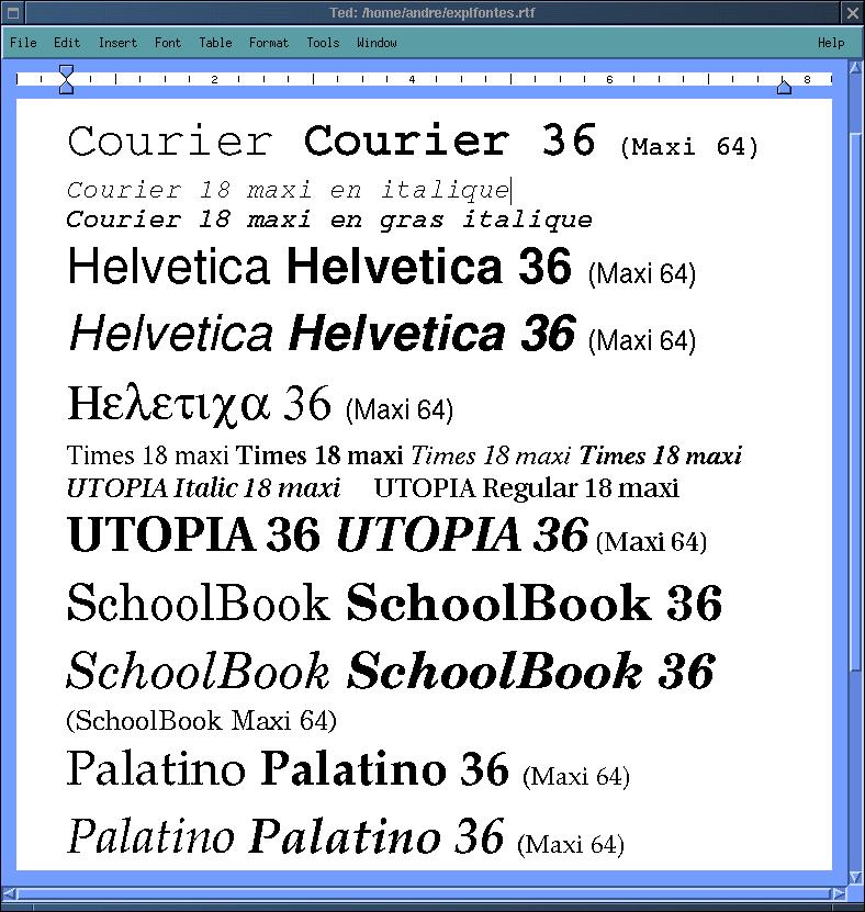 Helaas ben ik er ondanks herhaalde pogingen alleen in geslaagd de lettertypen Utopia, New Century SchoolBook en Palatino in /usr/local/afm te importeren. Ik heb ze zonder problemen in Ted gebruikt in puntgrootten variërend van 8 tot 64. Natuurlijk zijn dit maar een paar lettertypen maar het zijn wel juist drie lettertypen die een grote overeenkomst vertonen met Times New Roman. Voeg daaraan toe het feit dat Helvetica grote overeenkomst vertoont met Arial (samen zijn dit de meest gebruikte letterypen onder Windows) en we hebben precies de belangrijkste lettertypen die nodig zijn om te werken met een document dat onder Windows is gemaakt.