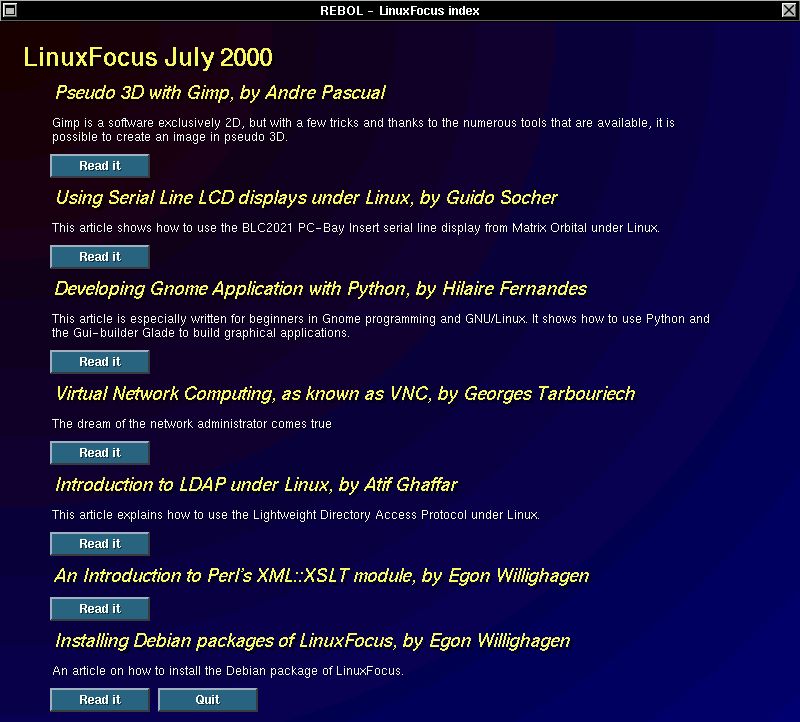![]() door Georges Tarbouriech <georges.t(at)linuxfocus.org> Over de auteur: Georges gebruikt al lang Unix (zowel commerciële als gratis versies). Vanaf het begin is hij een Rebol fan. Als je Frans kunt lezen kun je eens naar een artikel kijken dat hij twee jaar geleden over Rebol schreef op http://www.amiganews.com/ANN/ no117/rebol.shtml Vertaald naar het Nederlands door: Mylène Reiners <mylene.reiners(at)cmg.nl> Inhoud: |