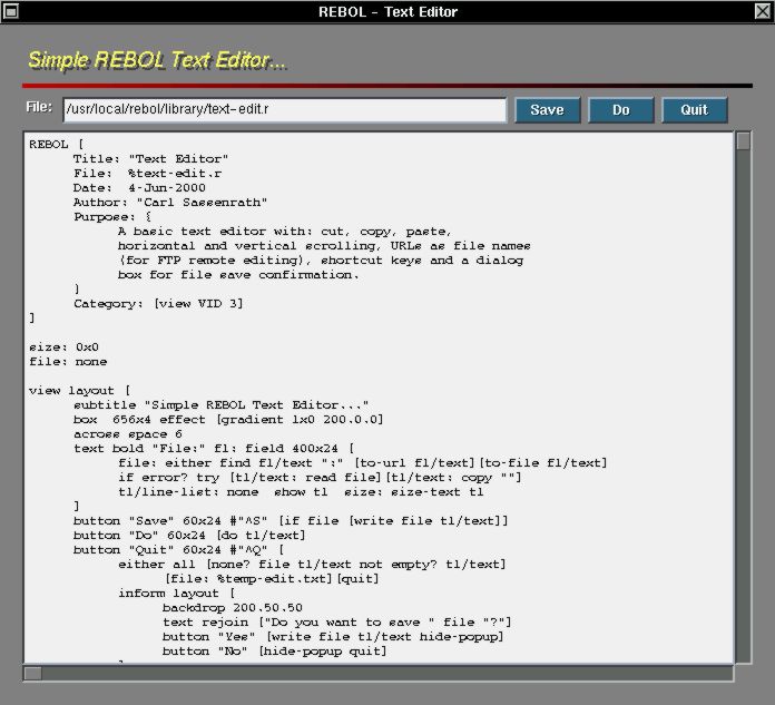Als Rebol nieuw voor je is (trouwens ook als dat niet het geval is!) kun je het beste de voorbeeld scripts dowloaden. Het zijn er ongeveer 200!
