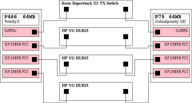 The ideas and hints I got from the mailing list discussion shown in Section 7.1 lead to a new hardware-setup shown in Figure 2. The setup is intended to provide a default machine (guess which one). The bridge has 3 HP cards of which each is connected to a HP VG15 hub. The 3com card is connected to a 3com Superstack Fast Ethernet switch.