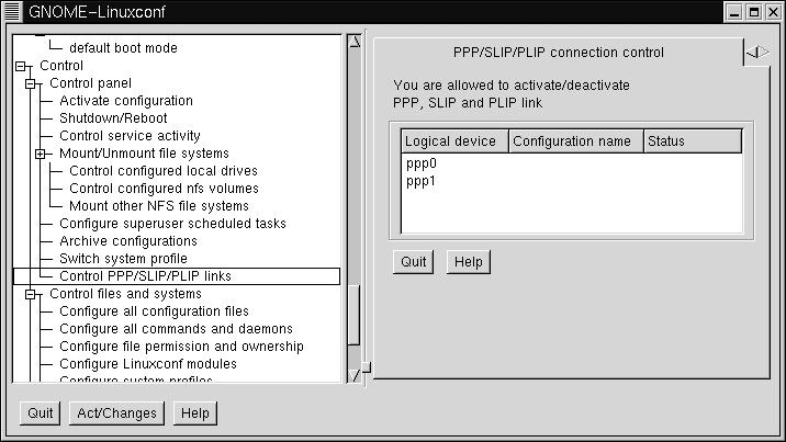 Linuxconf's PPP section is fairly simple. First of all, open up Linuxconf. This must be done as root. Here's a shot of Linuxconf in action: