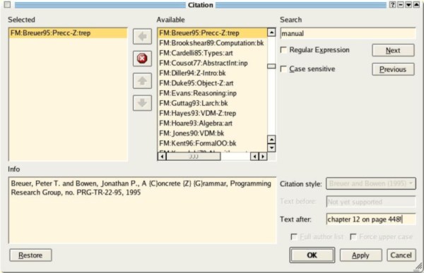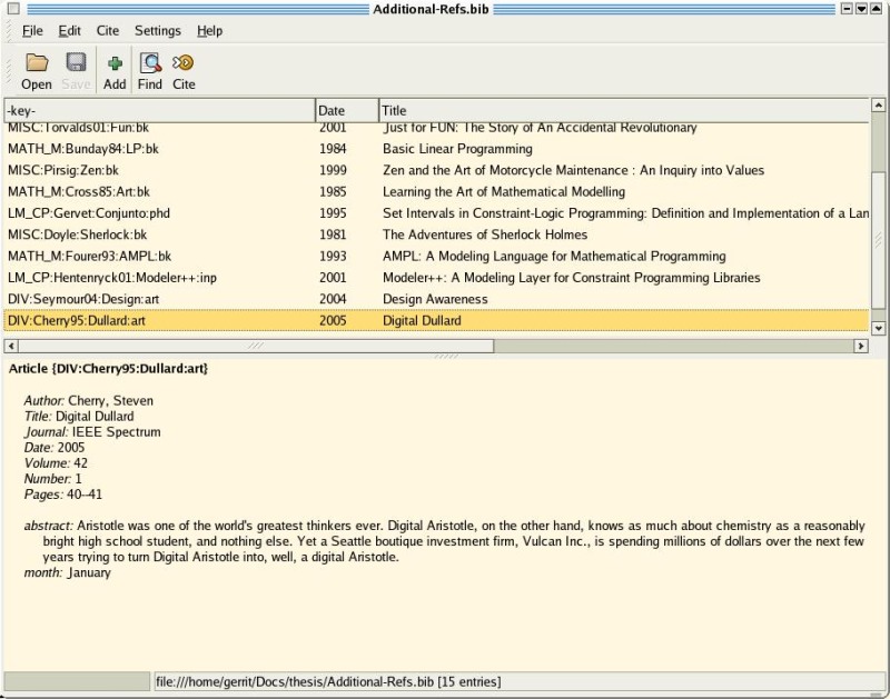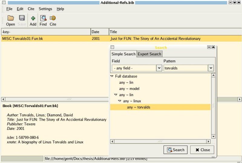 Para la primera opción, a modo de ejemplo puede ver la primera versión de este artículo aquí (lyx_article.lyx). Si nunca antes ha visto una base de datos BibTeX, aquí tiene un archivo ejemplo (example_bibtex_database.bib). Como ve, no es más que  un texto de marcas estandarizado para datos bibliográficos. Y no es necesario enredar en él, ya que existe una magnífica herramienta de bases de datos llamada pybliographer, que permite la total administración de tales bases de datos, incluyendo  la búsqueda incremental de texto con múltiples atributos y la conversión a otros formatos, p. e., HTML. Aquí tiene una captura de pantalla que muestra una búsqueda incremental: