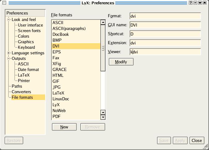 En primer lugar LyX necesita verificar su instalación. Antes de la primera edición pulse Edición -> Volver a configurar, lo que actualizará la base de datos interna. Cada vez que cambie algo en su instalación de LATEX, deberá repetir ese paso. Puede revisar cómodamente los resultados de esa acción por medio de Ayuda -> Configuración de LATEX, que también le dirá dónde obtener los paquetes que puedan faltar. Merece la pena habilitar la copia de seguridad automática en Edición -> Preferencias->Interfaz del usuario->Documentos, no cuesta nada y es una opción muy útil. El visor por defecto es xdvi; es muy recomendable cambiar esta opción por kdvi, como se muestra en esta captura de pantalla. Esto le proporcionará un visor muy fácil de usar. Los cambios no se aplican hasta que pulse Modificar.