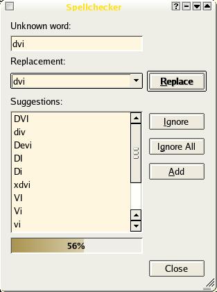 Este último es muy útil si quiere obtener información sobre diferentes paquetes; dicha documentación se encuentra en /usr/share/texmf/doc/index.html. Como requisitos complementarios, compruebe que dispone de aiksaurus (un thesaurus que se utiliza durante la edición) y, más importante, del revisor ortográfico aspell. Aspell tiene paquetes para varios idiomas además del inglés. En LyX este revisor ortográfico se activa por medio de F7 ( captura de pantalla).