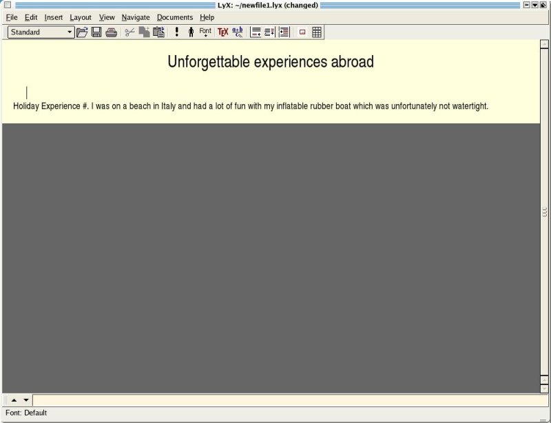 Tras editar este archivo (un_modificado_article.layout), guárdelo en $HOME/.lyx/layouts, reconfigure, reinicie y ¡voilá!, ahora encontrará una clase de documento denominada ''Mis vacaciones'' en el selector de estilo del documento. Aquí tiene un documento ejemplo que utiliza el nuevo archivo de estilo (un_modificado_article.layout). Puede encontrar más información en [3(V. notas)].