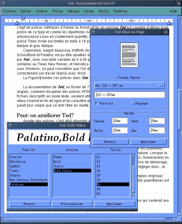 Jedoch, trotz vieler Versuche meinerseits, ist es mir nur gelungen die Schriften Utopia, New Century SchoolBook und Palatino in das Verzeichniss /usr/local/afm zu verschieben, damit Ted sie erfolgreich in verschiedenen Grössen zwischen 8 und 64 Punkten, benutzen kann. Es ist wenig, aber da diese drei Schriften dem Times New Roman sehr ähnlich sind und da Helvetica Arial ähnlich ist, und da dies die unter Windows am meist benutzen Schriften sind, kann man davon ausgehen, dass man das notwendigste besitzt um seine mit Word begonnene Arbeit zu importieren.
