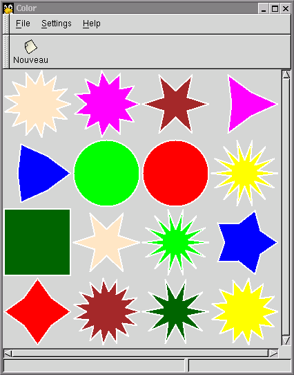 En tant que première approche de programmation Gnome-Python je propose une simple jeu de couleur où des enfants doivent reconnaître des formes de la même couleur. Cet exemple est très orienté graphisme et utilise des possibilités sympathiques de Gnome comme le Gnome Canvas et la fenêtre d'application Gnome. Les règles de ce jeu sont plutôt simples: la grille de jeu est remplie avec 16 formes -cercles, étoiles et carrés- de différentes couleurs. Ces 16 formes sont réparties en 8 paires de couleurs identiques. Vous pouvez d'abord jeter un coup d'oeil au code à la fin de ce document pour avoir une idée générale puis reprendre votre lecture ici.