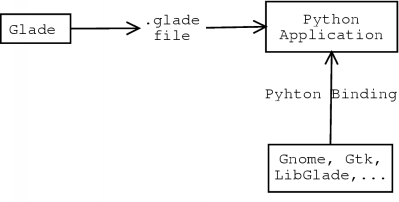 Le graphique ci-dessous montre ce mécanisme général. Pour comprendre comment l'édition de liens Python est implémentée, il est parfois nécessaire de regarder les modules Python Gtk, Gnome et LibGlade situés dans PYTHONPATH afin de les comparer à la documentation C du développeur Gtk/Gnome.