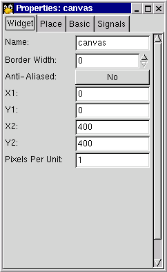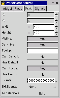 Ensuite, ajoutez un canvas dans la fenêtre principale du widget de l'application Gnome. Dans le dialogue properties définissez ses coordonnées maximales à 400 et sa hauteur maximale à 400.