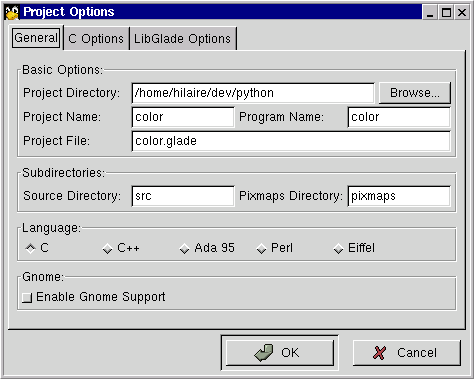 Appeler les Project Options en cliquant sur le bouton Options dans la barre d'outils de Glade. Dans la feuille General définissez les paramètres du projet comme suit: