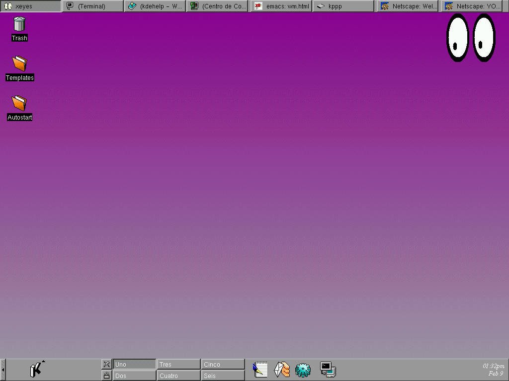 Après avoir déclaré les variables d'environnement et quelques "configure;make;make install" la première impression laissée par l'environnement est excellente. Nous avons un GUI d'aspect commercial et je ne peux que conseiller au lecteur de ne pas être timide et de " surfer ". En peu de temps, on se familiarise avec les outils du bureau et il est facile de personnaliser KDE sans problèmes. L'aspect général et le comportement de KDE peuvent être configurés avec un style de bureau Windows 95 ou Motif, coloré comme CDE, KDE, etc., ou même utiliser des palettes spécifiques de votre choix. Dans le dessin suivant, j'ai capturé mon bureau configuré comme Motif style CDE (de la sorte, il ne me rappelle pas d'autres OS que j'ai abandonnés depuis longtemps. :) )