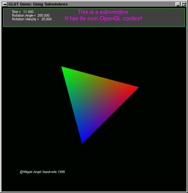 Quand GLUT ouvre une sous-fenêtre il lui fournit un environnement OpenGL complet. Il y a donc une baisse des performances induite par l'utilisation de sous-fenêtres car le driver de la carte vidéo doit rafraîchir la zone mémoire pour chaque fenêtre en plusieurs passes. Grâce à des environnements OpenGL indépendant, chaque fenêtre peut avoir son propre système de coordonnées par exemple. Dans ../../common/March1998/example1.c le système de coordonnées est défini dans mainDisplay() et subDisplay() respectivement. Regardez ces deux fonctions, elles sont assez simples et si vous avez suivis notre article de janvier sur OpenGL (" rendu de polygones " ) vous n'aurez pas de mal à les comprendre.