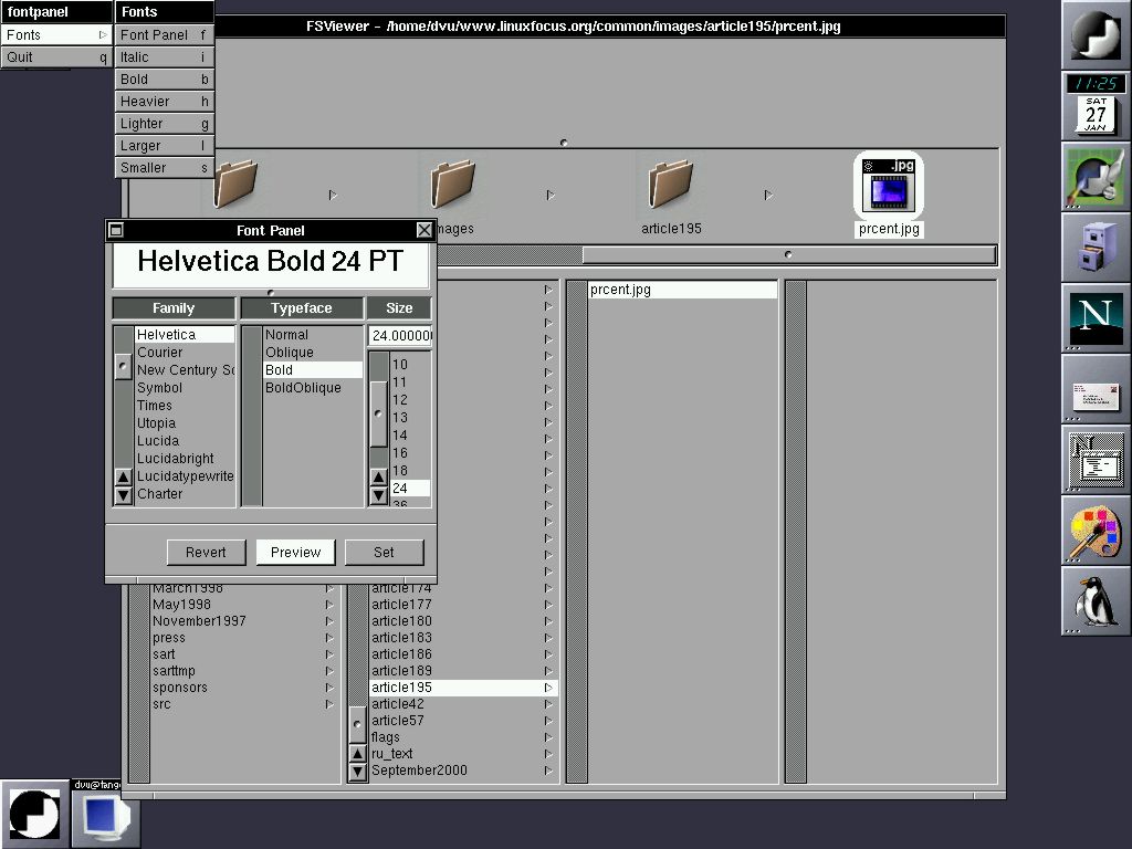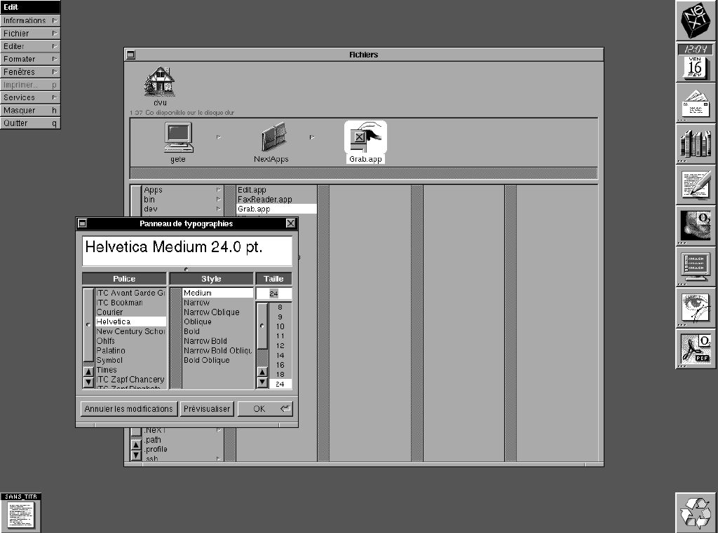 Parmi ces exemples, le "font panel" (fenêtre de polices) est très réussi. On dirait vraiment l'original. Au fait, au long de cet article nous proposerons des photos d'écran de GNUstep et de NeXTStep, ainsi vous pourrez comparer. Voici le premier exemple : le "font panel" de GNUstep et celui de NeXTstep.