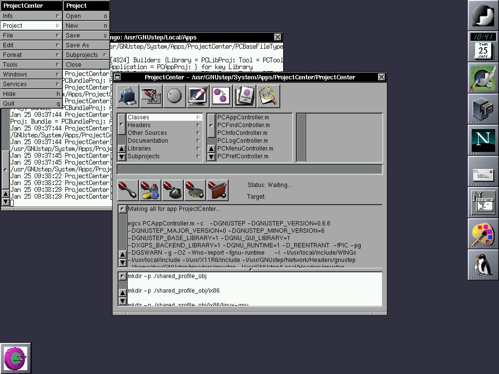 Toutefois, n'oublions pas que GNUstep est particulièrement conçu pour le développement. Une fois qu'il sera devenu un peu plus abouti, vous pourrez développer des applications aussi facilement que c'était le cas sous NeXTstep. GNUstep est beaucoup plus qu'un simple environnement, nous pourrions dire qu'il s'agit d'un énorme IDE (Integrated Development Environment). Le plus important semble que ces applications seront facilement portables, vers MacOS X, par exemple.