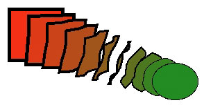 Voor bovenstaand voorbeeld heb ik drie "blend" effecten tegelijk gebruikt (6 objecten, 2 aan 2). "Blend" werkt slechts op twee objecten en het resultaat kan niet worden gecombineerd met andere objecten. Het is wel mogelijk om het te veranderen door bepaalde stukken te selecteren en daarbij het aantal stappen of de kleur te variëren.